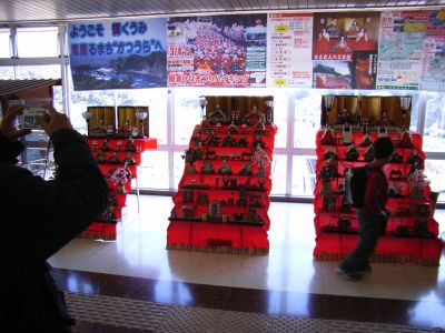 勝浦駅のホームでいきなり雛壇がお迎えです。この日は朝早くからスゴク混んでます。この祭りにあわせたJRのウォーキングイベントもやってて、勝浦駅 は家族連れや年配の方でごったがえしてました。 |