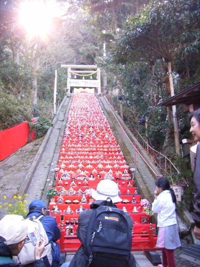 そして、ついにやって来ました、メイン会場の「遠見岬神社」。神社の石段が全てお雛さまです。全部で約1,200体あるそうです…。私は、これだけのお雛さまを見たのは生まれて始めてです…。 |