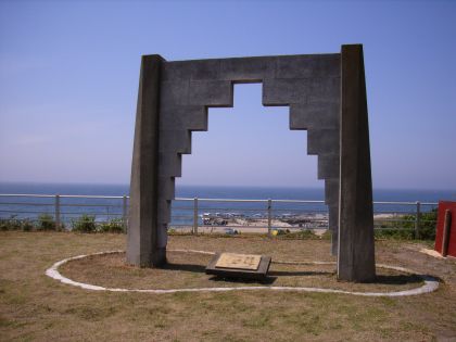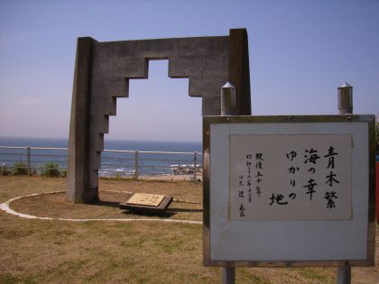 ↑この不思議な建造物は、かの有名な画家青木繁の記念碑です。実は、青木繁の『海の幸』はこの海岸(布良海岸)をモデルにしているんです(『海の幸』って、よく小学校の美術室に飾ってあったりする、海岸で大きな魚を裸の男たちが抱えている絵です)。 |