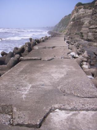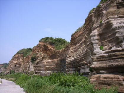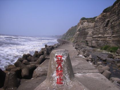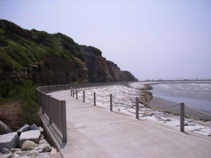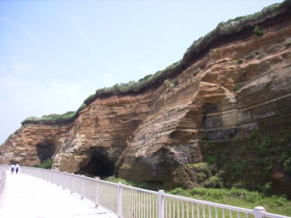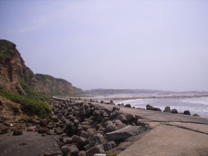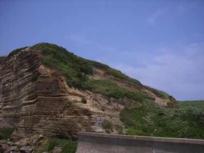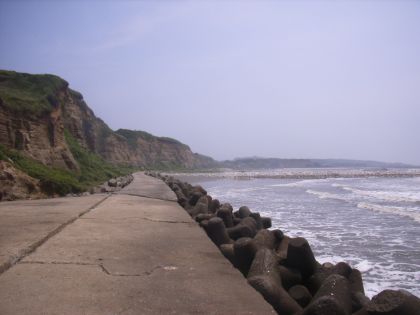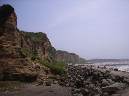 これが有名な(?)「屏風ヶ浦」。銚子から飯岡町刑部岬まで、約10キロにわたる海岸の絶壁(海抜40〜50m)が続いてます。英仏海峡のドーバーの「白い壁」に匹敵するといわれ、「東洋のドーバー」と言われてま〜す。 |